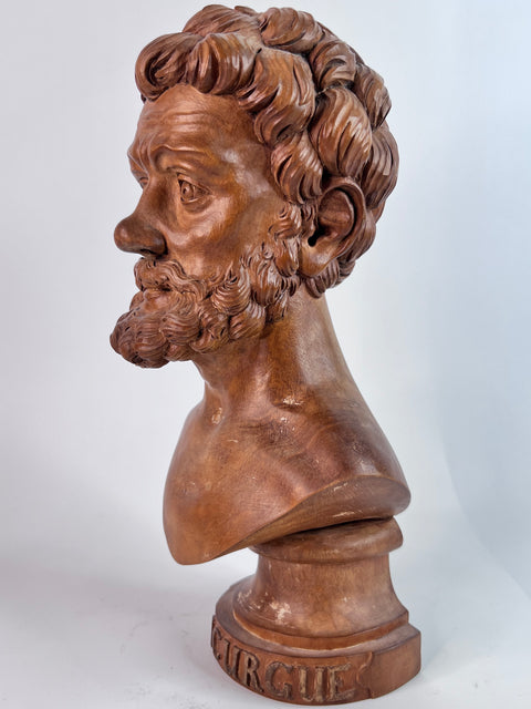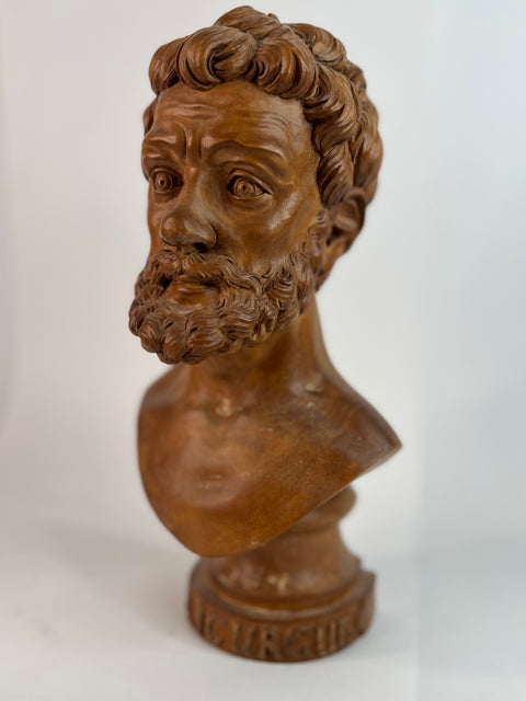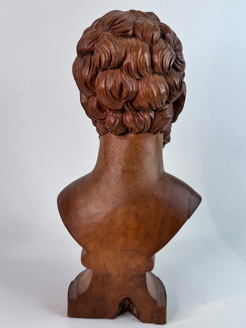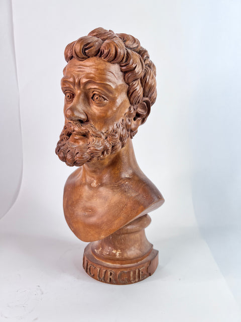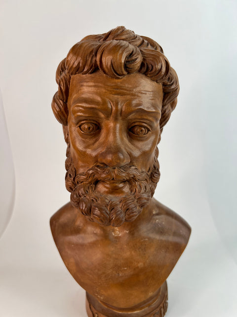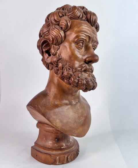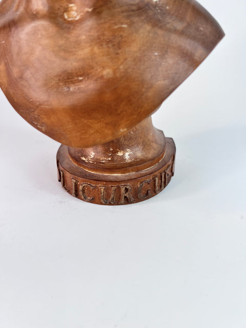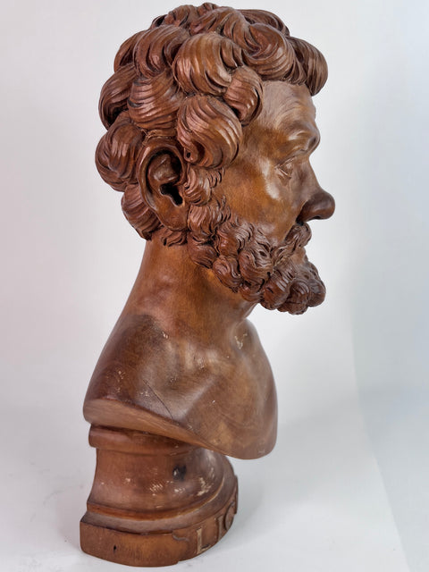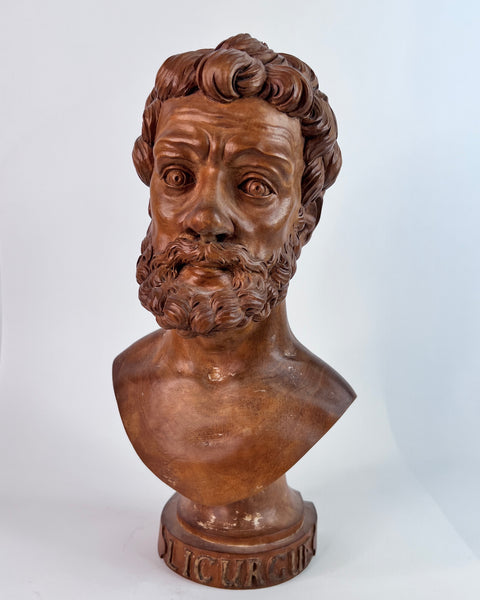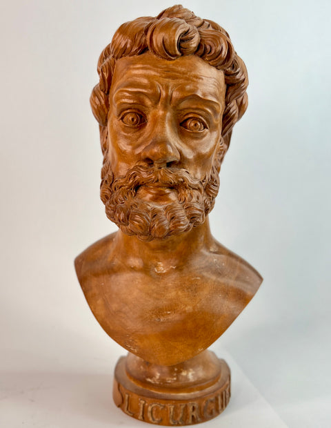 This finely carved 18th century wooden bust of Lycurgus of Athens after the antique is a masterpiece that pays homage to the ancient Greek statesman and lawgiver. Crafted with exquisite detail, it showcases the beauty and grace of the original Greek statue.