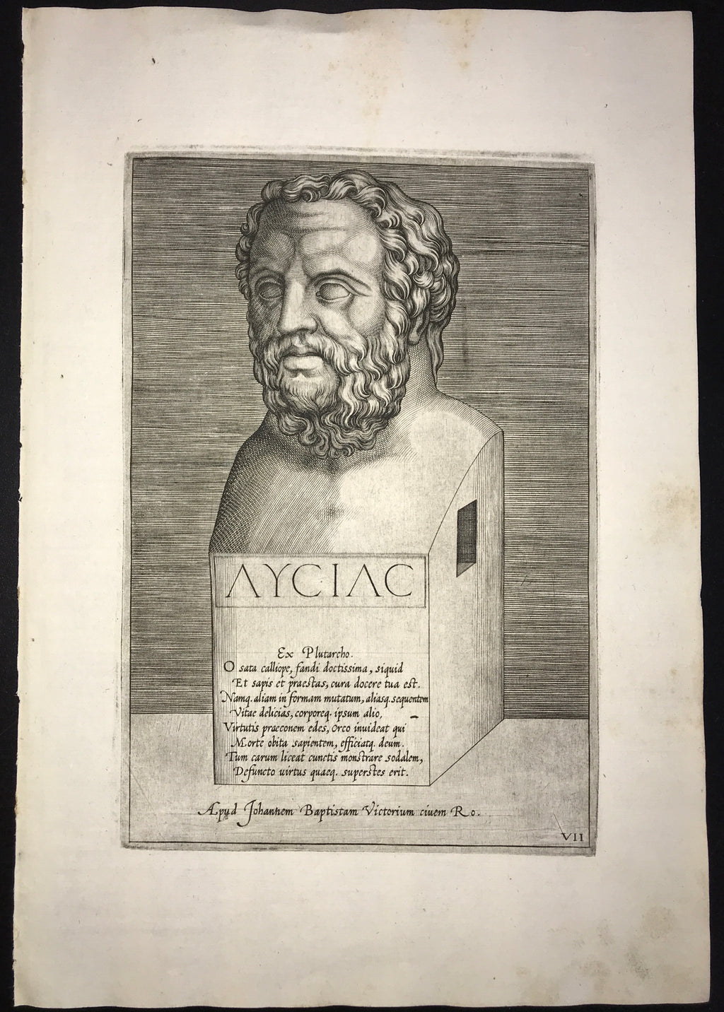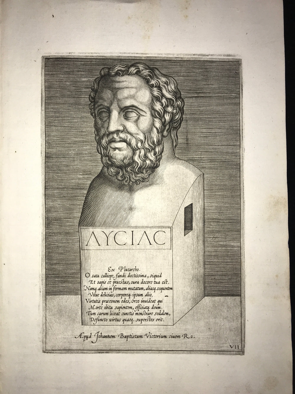 The Portuguese humanist Aquiles Estaço (Achille Stazio) (1524 - 1581) was the author of one of the first collections dedicated to ancient iconography. The volume contains 52 tables related to as many herm-portraits in marble, mostly ancient, depicting famous characters on a neutral background and shaded. The Latin caption shows the name of the collection. Despite having no signature, it is generally believed that the plates and the title page are the work of the engraver Agostino Musi, called Agostino Veneziano (1490 circa - post 1536).