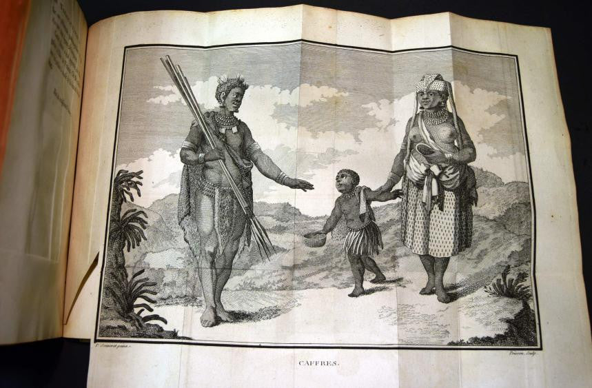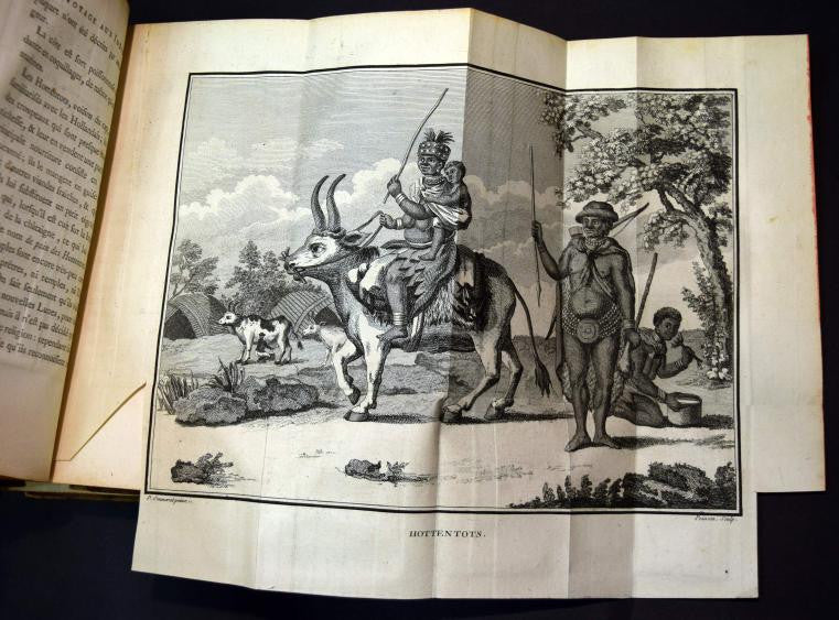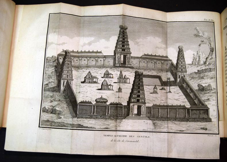 Pierre Sonnerat (1748-1814) était un naturaliste et explorateur français qui fit plusieurs voyages vers l’Asie du Sud-Est entre 1769 et 1781. Il publia en 1782 ce récit en deux tomes de son voyage de 1774-81. Le tome 1 traite exclusivement de l’inde, dont la culture suscitait une grande admiration chez Sonnerat, et il est particulièrement remarquable pour son exposé exhaustif de la religion en Inde, en particulier l’hindouisme. Le tome 2 couvre les voyages de Sonnerat vers la Chine, la Birmanie, Madagascar, les Maldives, Maurice, Ceylan (aujourd’hui le Sri Lanka), l’Indonésie et les Philippines. L’ouvrage est illustré de gravures basées sur les dessins de Sonnerat. Les illustrations parmi les plus intéressantes sont les images de Sonnerat des différentes divinités Hindoues. Sonnerat était également un ornithologue assidu et un collectionneur d’oiseaux, et le livre décrit et dépeint plusieurs espèces qu’il fut le premier à identifier.