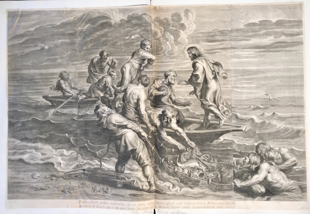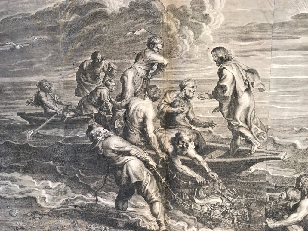 The miraculous draught of fishes; with seven apostles, one of them down, Christ standing on the boat; after Peter Paul Rubens. c.1638 Engraving