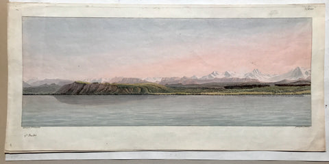 Vue générale de la chaîne des Alpes depuis Neuchâtel, gravée au burin sur cinq feuilles par Jakob Samuel Weibel d'après un dessin de Jean-Frédéric d'Ostervald, vers 1806